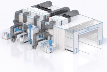 - Вытяжную стену SPK-PTS с лабиринтными фильтрами мощностью 60 000 м³/ч и ручными воротами для защиты фильтров;